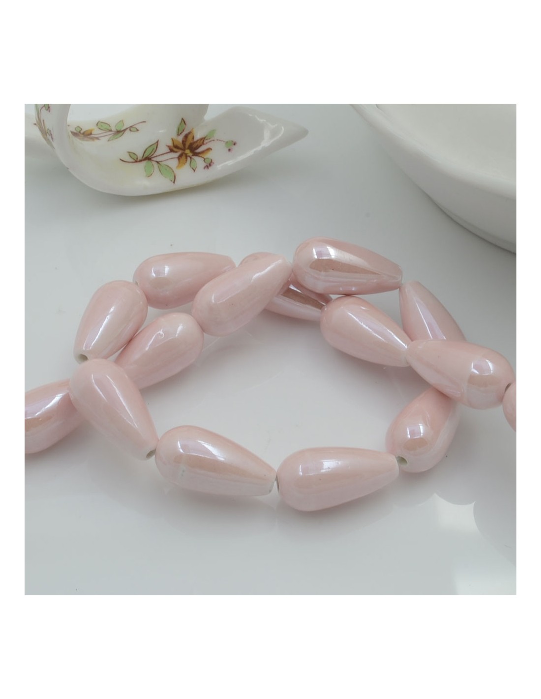 Perle a forma di goccia di misura 10x20mm, realizzate in ceramica luminosa e smaltata di colore rosa chiaro; ogni filo contiene circa 16 pezzi.