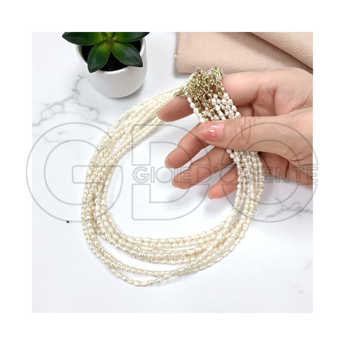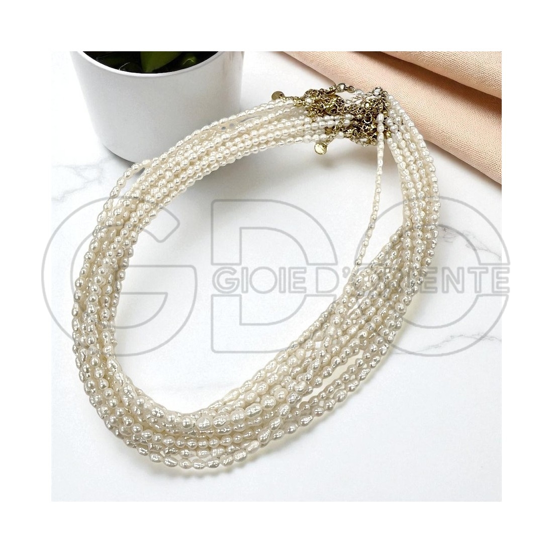 Collana raffinata realizzata con piccole perle di fiume naturali dalla forma irregolare a chicchi di riso di circa 4.5mm. Lunghezza base 40cm con catena regolabile di 5cm e moschettone in acciaio inossidabile placcato oro. Ideale per cerimonie, matrimoni o regali artigianali, è perfetta da indossare da sola, o da personalizzare con ciondoli.
