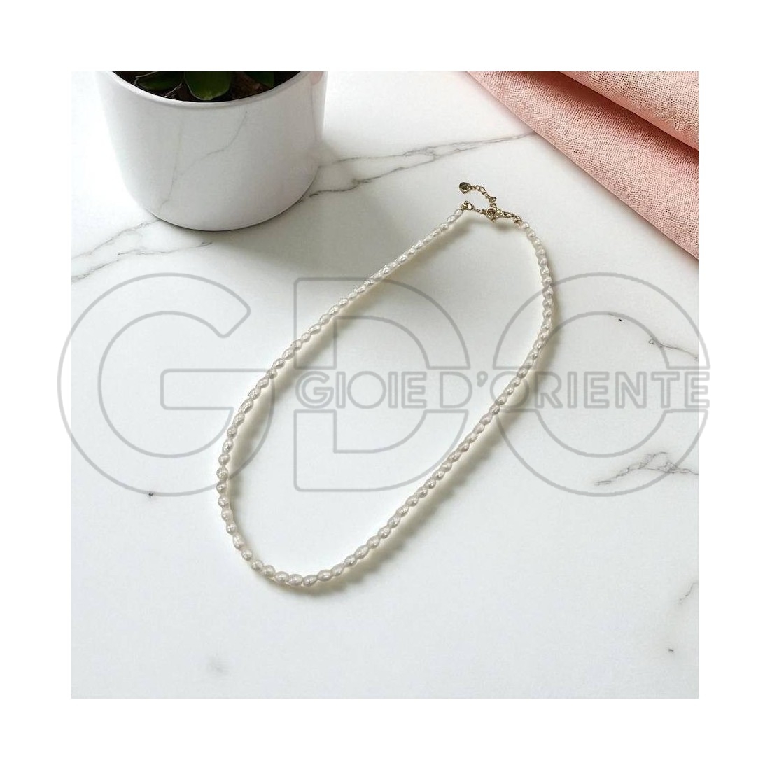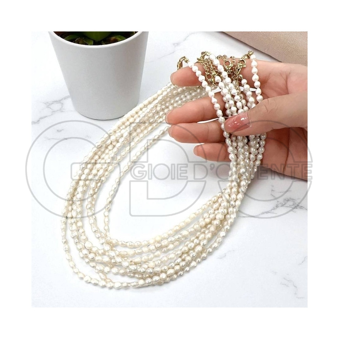 Collana di perle di fiume naturali dalla forma a goccine ovali irregolari di circa 4.5-5mm, con terminali e chiusura in acciaio inossidabile placcato oro, lunga 40cm con prolunga di 5cm.
