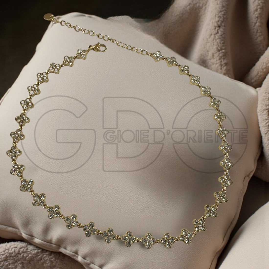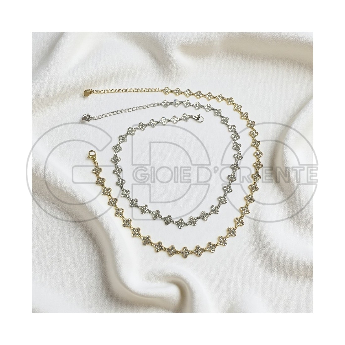 Girocollo con maglie a forma di fiorellini tempestati di zirconi di 8mm, su base in acciaio inossidabile nei colori rodio e oro; ha lunghezza di 37cm con prolunga regolabile di 8cm.