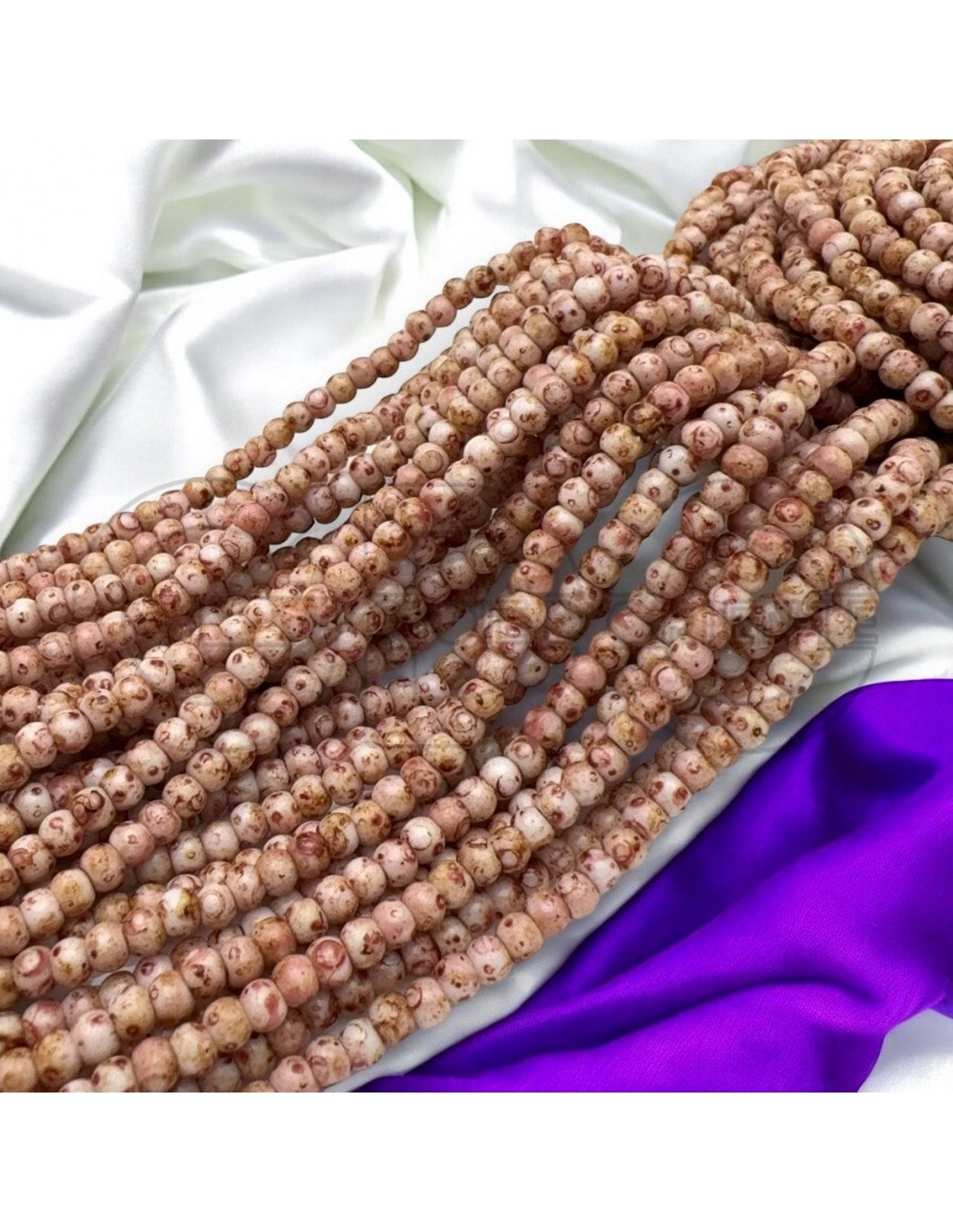 Perline in vetro a forma di rondelle di misura 3x4mm, di colore cipria scuro marmorizzato con foro di 1mm; ogni filo è lungo circa 45cm e contiene 135-140 pezzi.