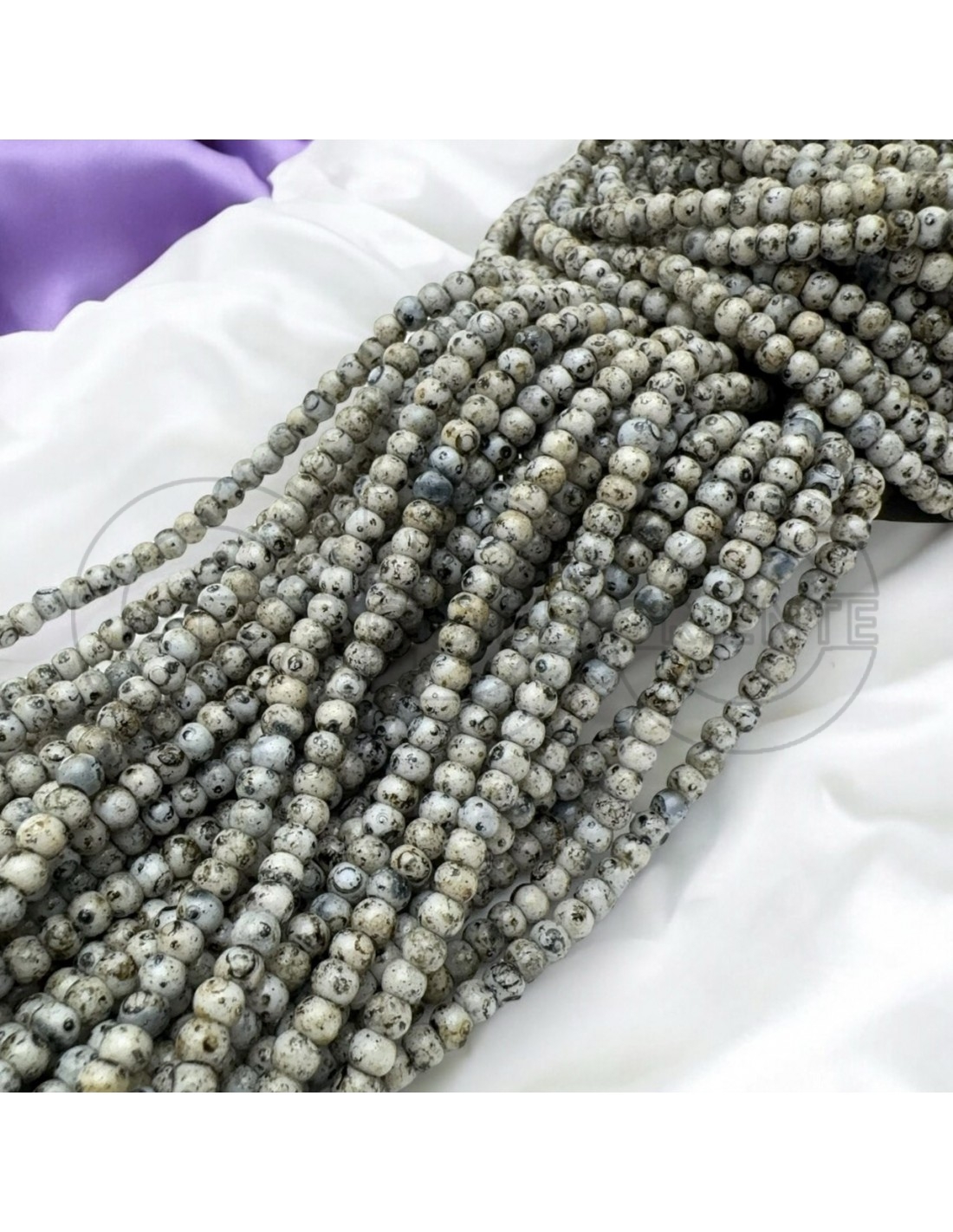 Perline in vetro a forma di rondelle di misura 3x4mm, di colore grigio marmorizzato con foro di 1mm; ogni filo è lungo circa 45cm e contiene 135-140 pezzi.