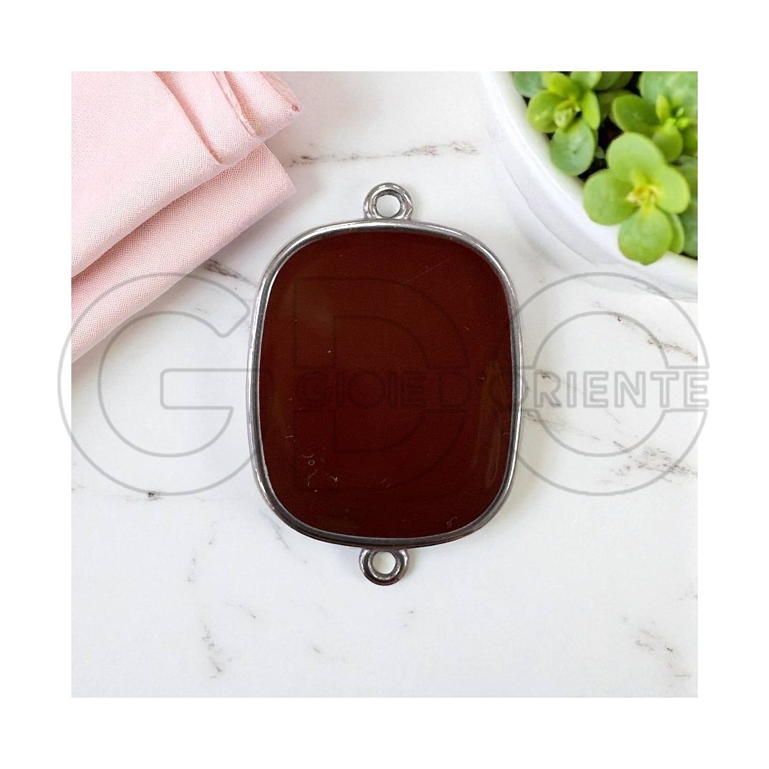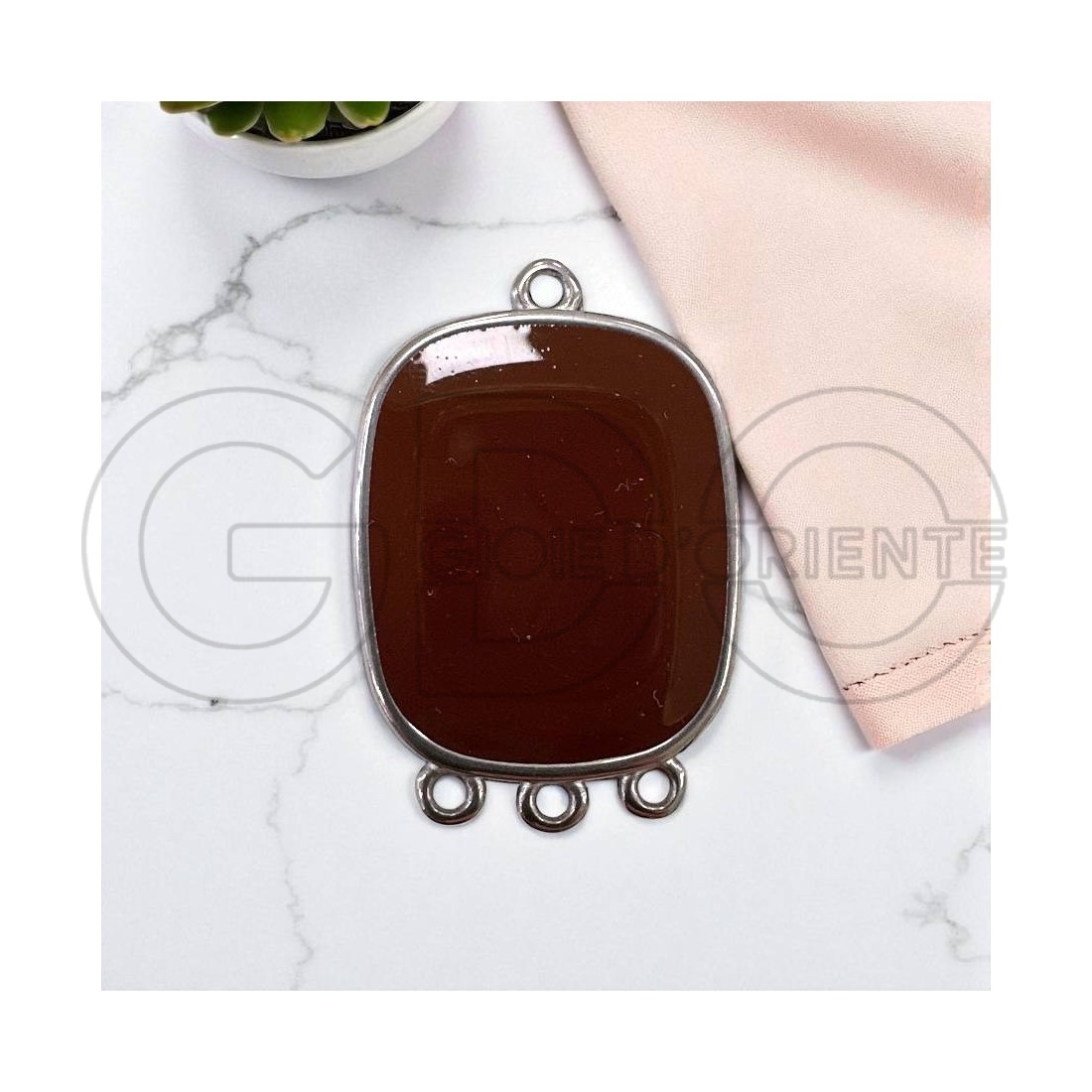 Piastrina realizzata con resina vetrificata marrone, con cornice esterna in acciaio inossidabile di misura 22x30mm, disponibile con 1 anellina, 2 anelline e 4 anelline.
