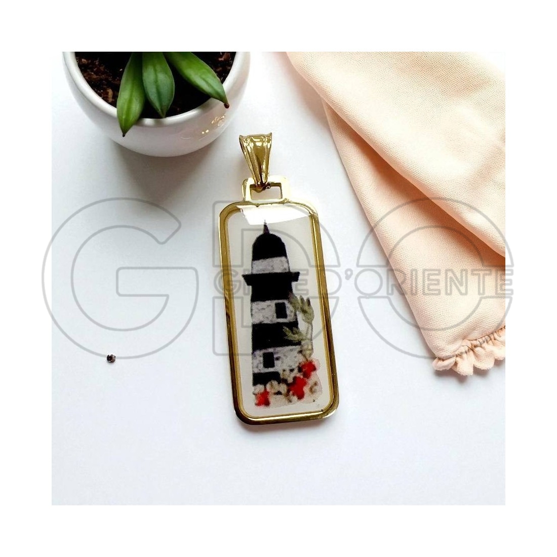 Medaglietta rettangolare con disegno di faro stampato e ricoperto da resina trasparente, su base in acciaio inossidabile placcato oro di dimensioni 14x33mm (le misure non comprendono il gancino portaciondolo).